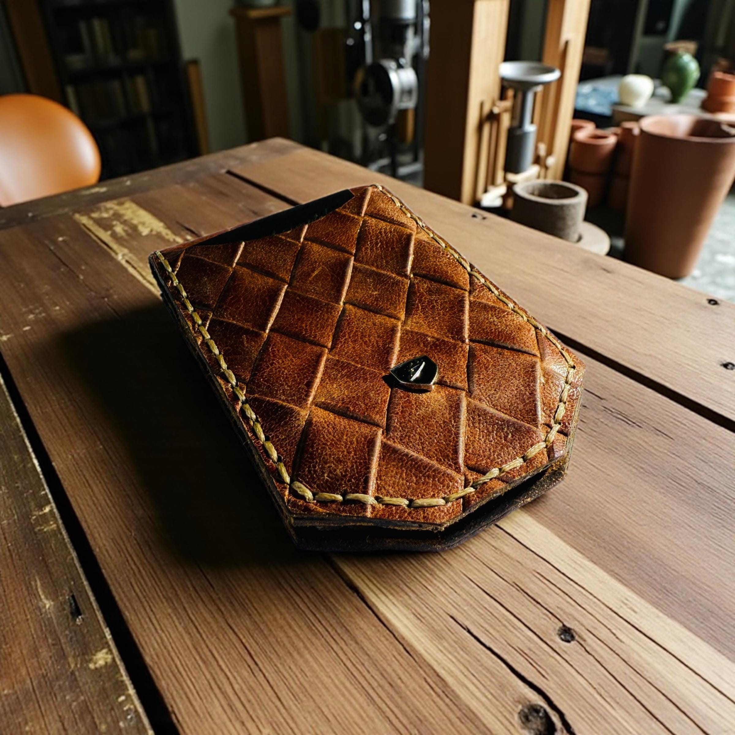 Our premier magnetic money clip wallet is crafted from genuine diamond-patterned embossed leather. Designed to hold 1–25+ bills, this wallet features a powerful magnetic clip, two convenient card pockets for credit or business cards, and includes an RFID-blocking card to keep your information safe.