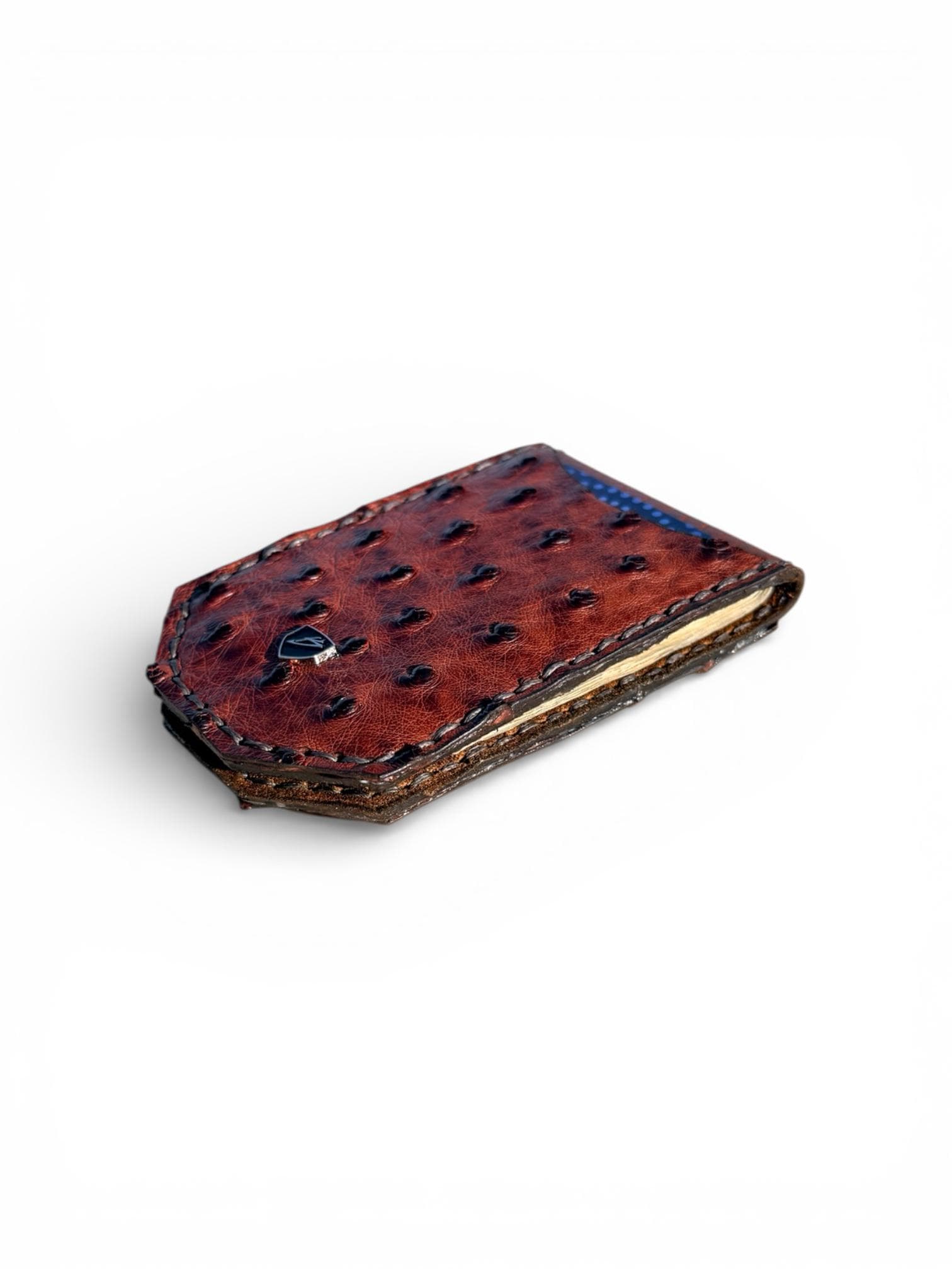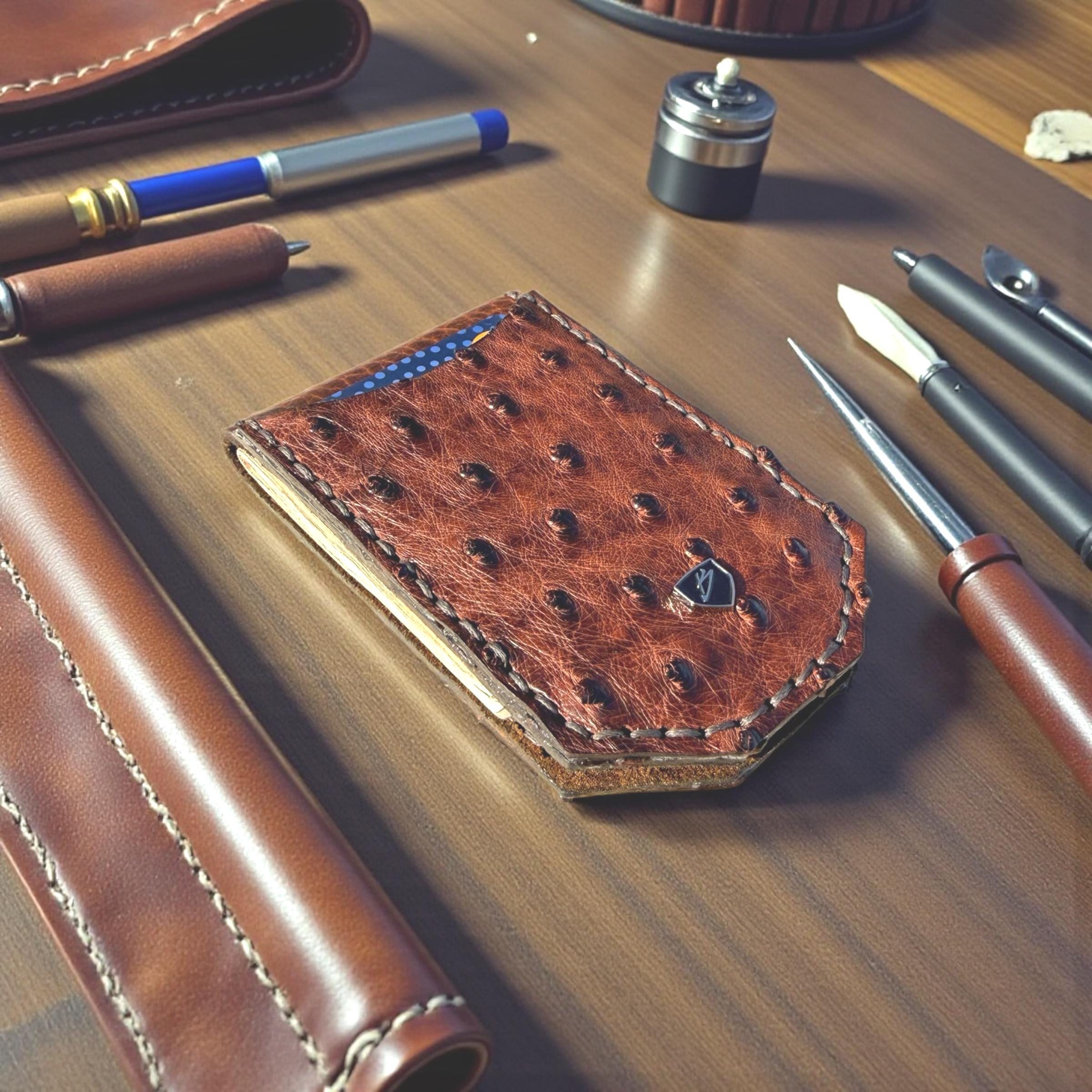 Each wallet is bench-built by hand using full-grain leather layered for structure and durability. The exterior features embossed ostrich leather for a refined, high-end appearance, while the interior is engineered to maintain its shape through daily use. Every cut, stitch, and edge is finished with precision to ensure a clean, timeless result.